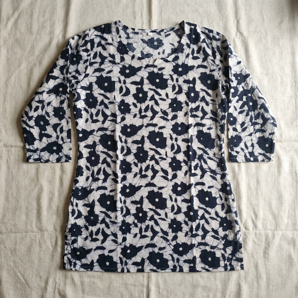 This navy blue and white printed cotton kurti features a round neckline with a subtle notch detail that adds a modern touch to its classic design. The all-over abstract floral print in contrasting white creates a bold yet elegant visual, making it suitable for both casual and semi-formal settings. Three-quarter sleeves and a straight silhouette offer ease of movement and a flattering fit.